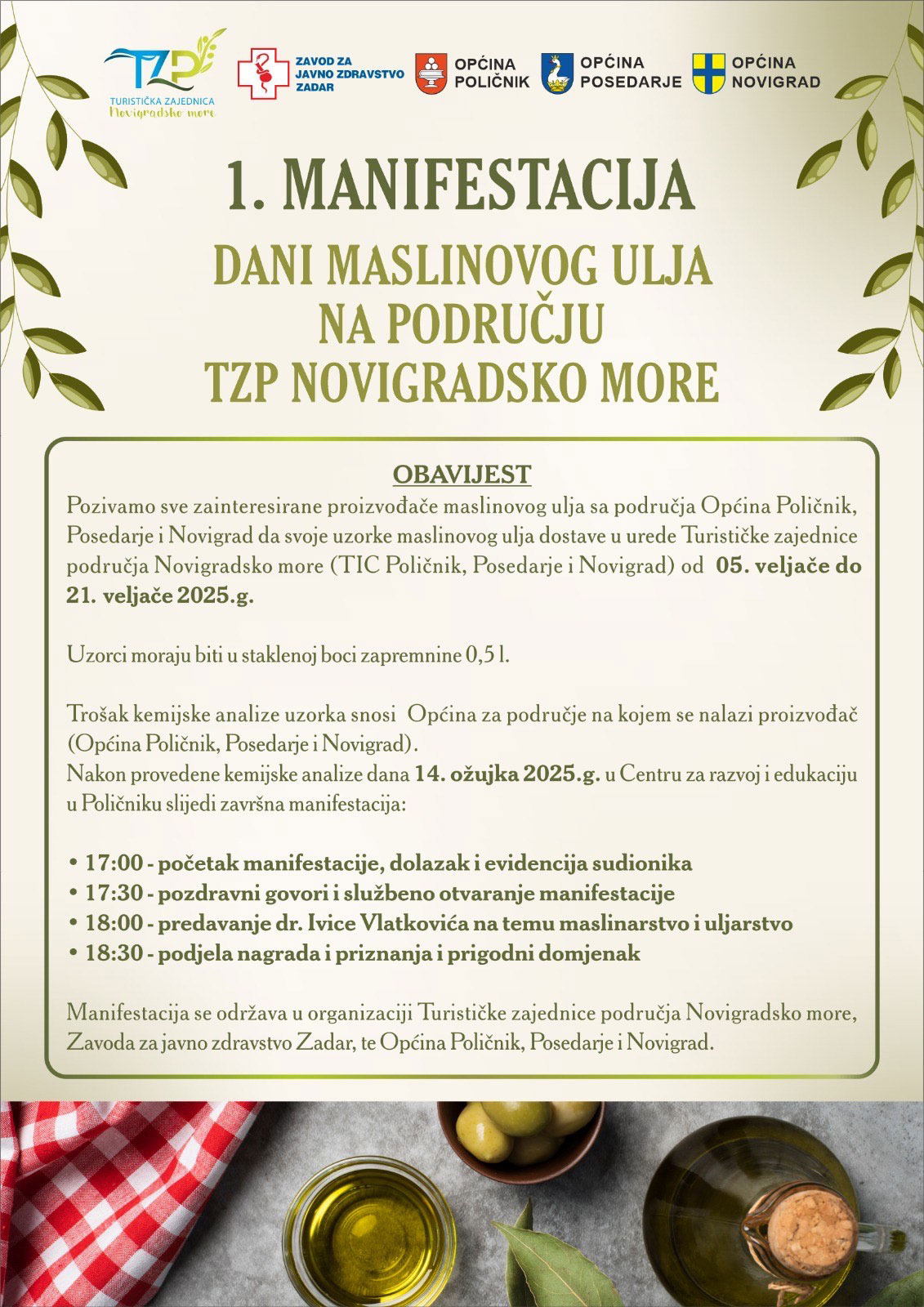 Pozivamo sve proizvođače maslinovog ulja sa područja Općine Poličnik, Posedarje i Novigrad da svoje uzorke maslinovog ulja dostave u uree Turističke zajednice područja Novigradsko more (ZIC Poličnik, Posedarje i Novigrad) od 5. veljače do 21. veljače 2025. g.