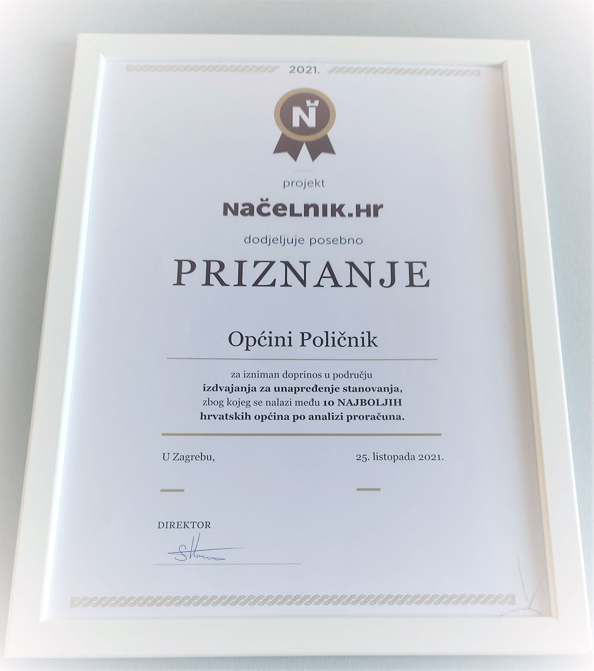Općina Poličnik dobila je još jedno u nizu priznanja za kvalitetan i uspješan rad. Portal Načelnik. hr je dodijelio priznanje za izniman doprinos u području izdvajanja za unapređenje stanovanja i to gledano po kriteriju iznosa ulaganja po glavi stanovnika gdje se nalazi među 10 najboljih Općina u Hrvatskoj. Izvor podataka za analizu navedenog područja je Ministarstvo financija (Izvršenje proračuna na razini 23).