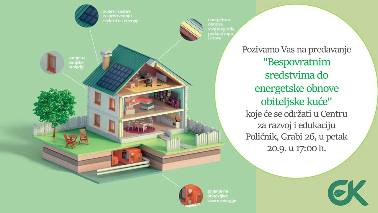 Pozivamo vas na predavanje o bespovratnim sredstvima energetske obnove obiteljskih kuća koje će se održati u prostorijama Centra za razvoj i edukaciju Poličnik, adresa Grabi 26, dana 20. rujna, petak u 17:00h.