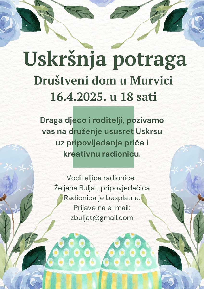 Draga djeco i roditelji, pozivamo Vas na druženje usuret Uskrsu uz pripovijedanje priče o kreativnu radionicu.